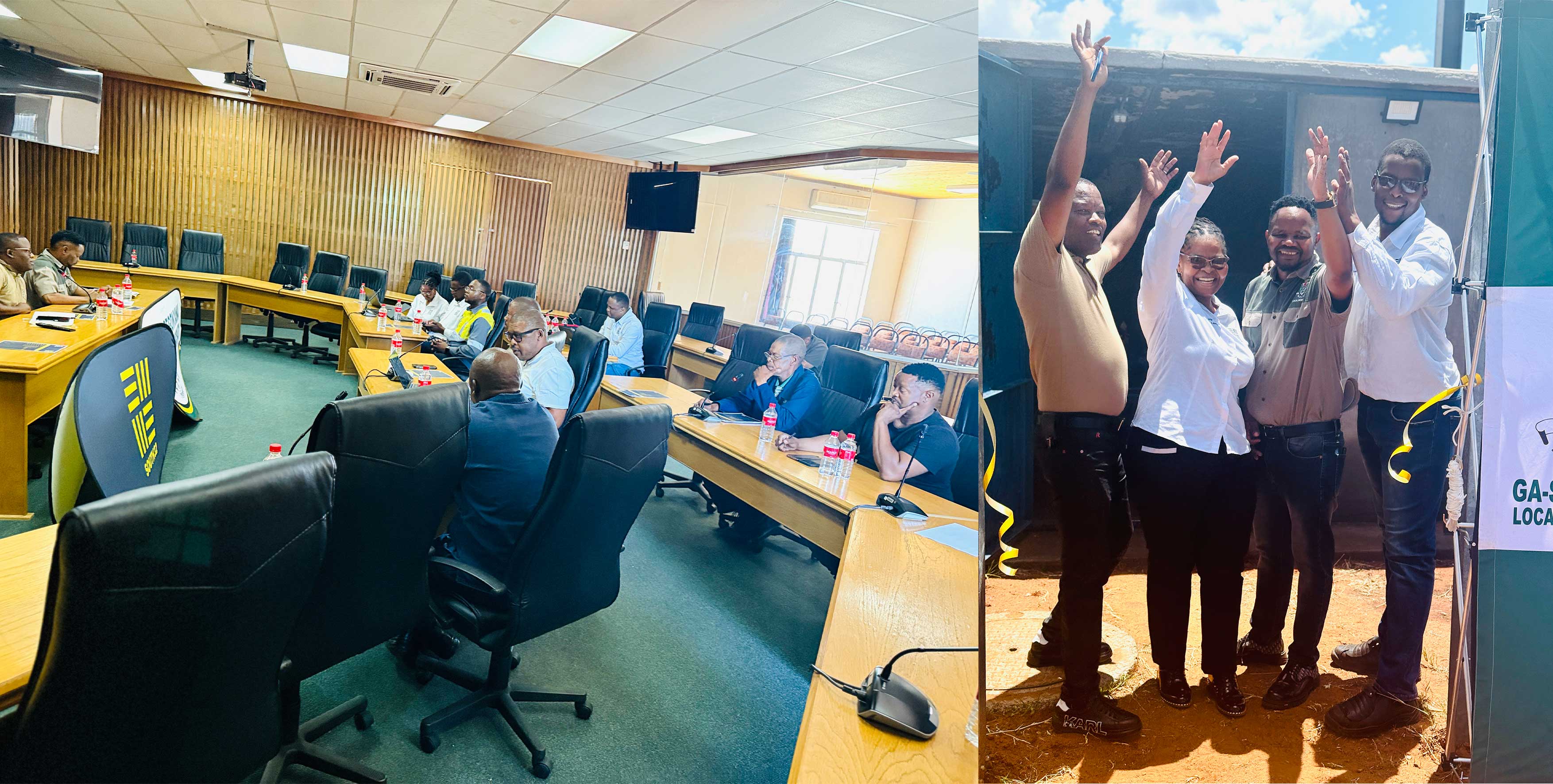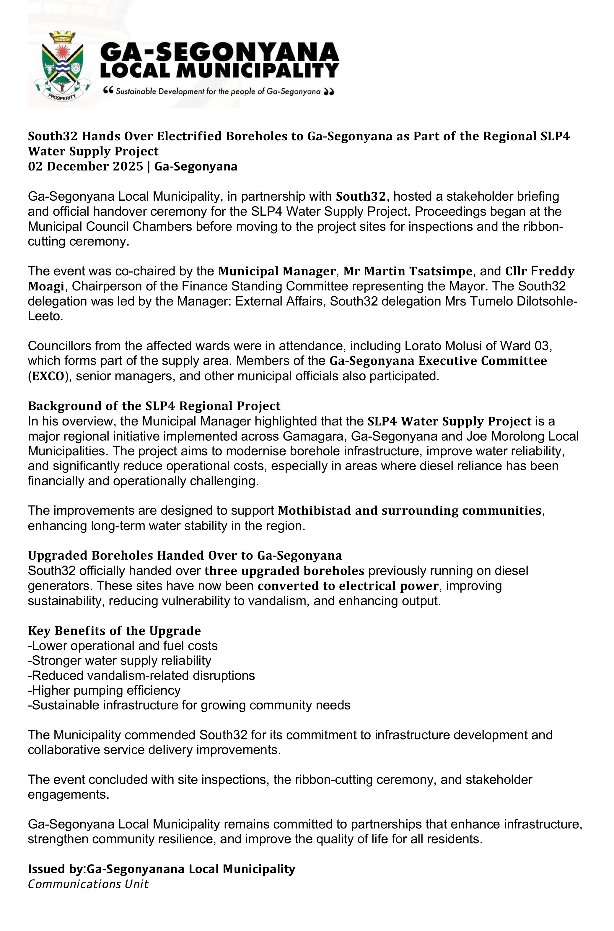 Ga-Segonyana Local Municipality, in partnership with 𝐒𝐨𝐮𝐭𝐡𝟑𝟐, hosted a stakeholder briefing and official handover ceremony for the SLP4 Water Supply Project. Proceedings began at the Municipal Council Chambers before moving to the project sites for inspections and the ribbon-cutting ceremony. The event was co-chaired by the 𝐌𝐮𝐧𝐢𝐜𝐢𝐩𝐚𝐥 𝐌𝐚𝐧𝐚𝐠𝐞𝐫, 𝐌𝐫 𝐌𝐚𝐫𝐭𝐢𝐧 𝐓𝐬𝐚𝐭𝐬𝐢𝐦𝐩𝐞, and 𝐂𝐥𝐥𝐫 F𝐫𝐞𝐝𝐝𝐲 𝐌𝐨𝐚𝐠𝐢, Chairperson of the Finance Standing Committee representing the Mayor. The South32 delegation was led by the Manager: External Affairs, South32 delegation Mrs Tumelo Dilotsohle-Leeto.