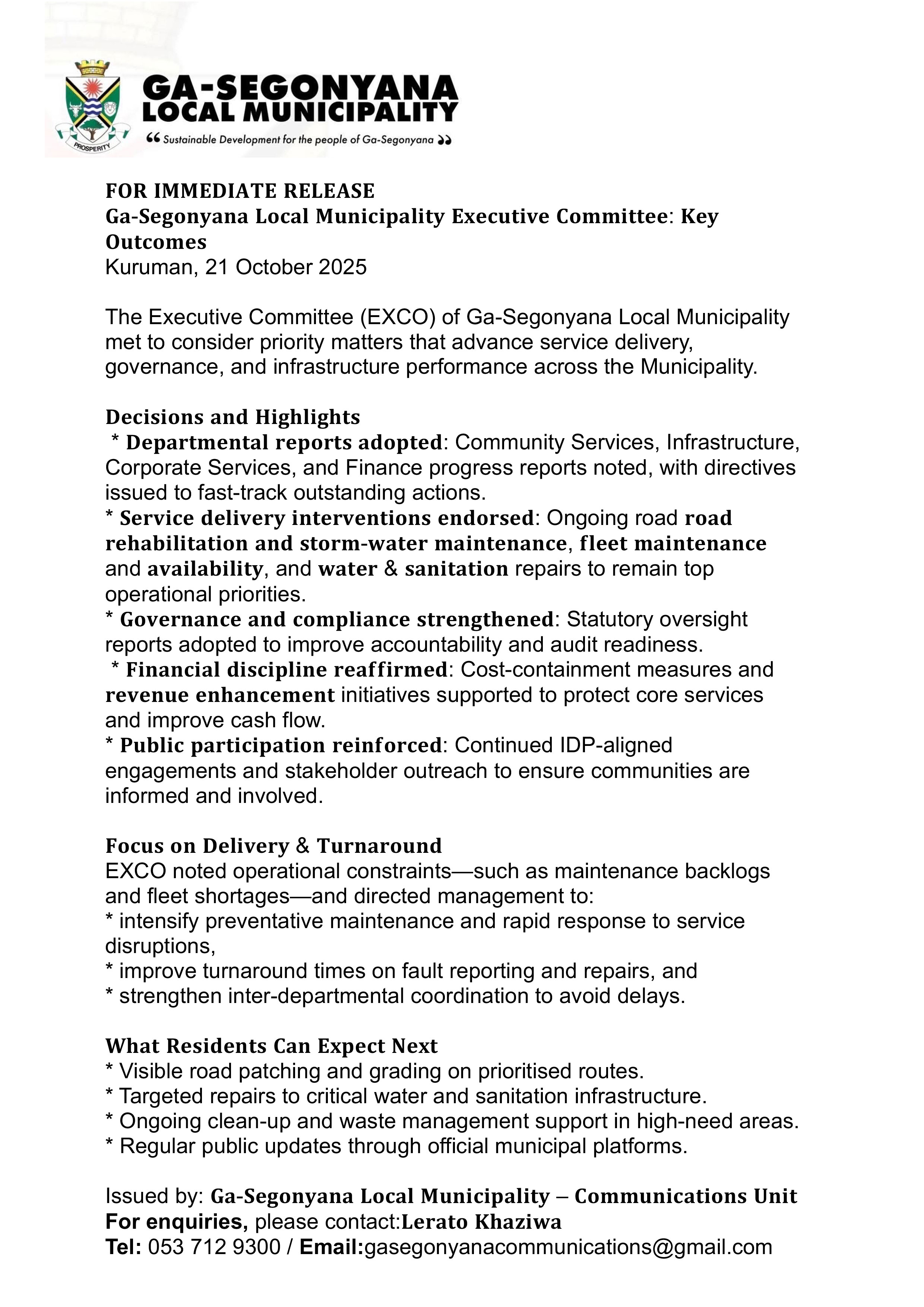 The Executive Committee (EXCO) of Ga-Segonyana Local Municipality met to consider priority matters that advance service delivery, governance, and infrastructure performance across the Municipality.