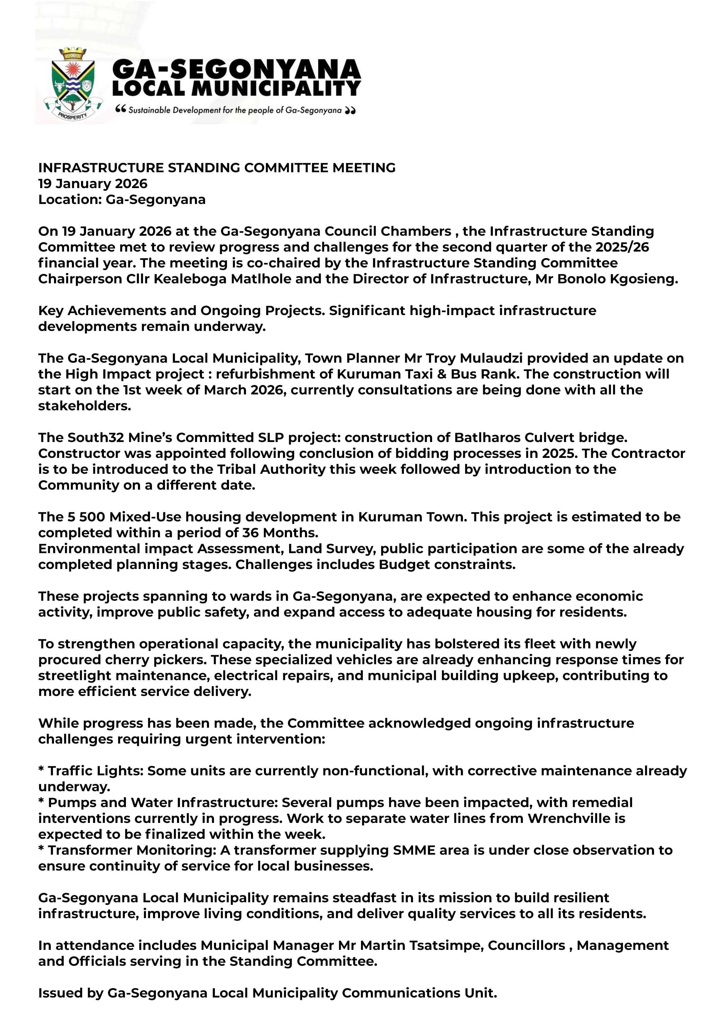 On 19 January 2026 at the Ga-Segonyana Council Chambers , the Infrastructure Standing Committee met to review progress and challenges for the second quarter of the 2025/26 financial year. The meeting is co-chaired by the Infrastructure Standing Committee Chairperson Cllr Kealeboga Matlhole and the Director of Infrastructure, Mr Bonolo Kgosieng. Key Achievements and Ongoing Projects. Significant high-impact infrastructure developments remain underway.The Ga-Segonyana Local Municipality, Town Planner Mr Troy Mulaudzi provided an update on the High Impact project : refurbishment of Kuruman Taxi & Bus Rank. The construction will start on the 1st week of March 2026, currently consultations are being done with all the stakeholders.On 19 January 2026 at the Ga-Segonyana Council Chambers , the Infrastructure Standing Committee met to review progress and challenges for the second quarter of the 2025/26 financial year. The meeting is co-chaired by the Infrastructure Standing Committee Chairperson Cllr Kealeboga Matlhole and the Director of Infrastructure, Mr Bonolo Kgosieng. Key Achievements and Ongoing Projects. Significant high-impact infrastructure developments remain underway.