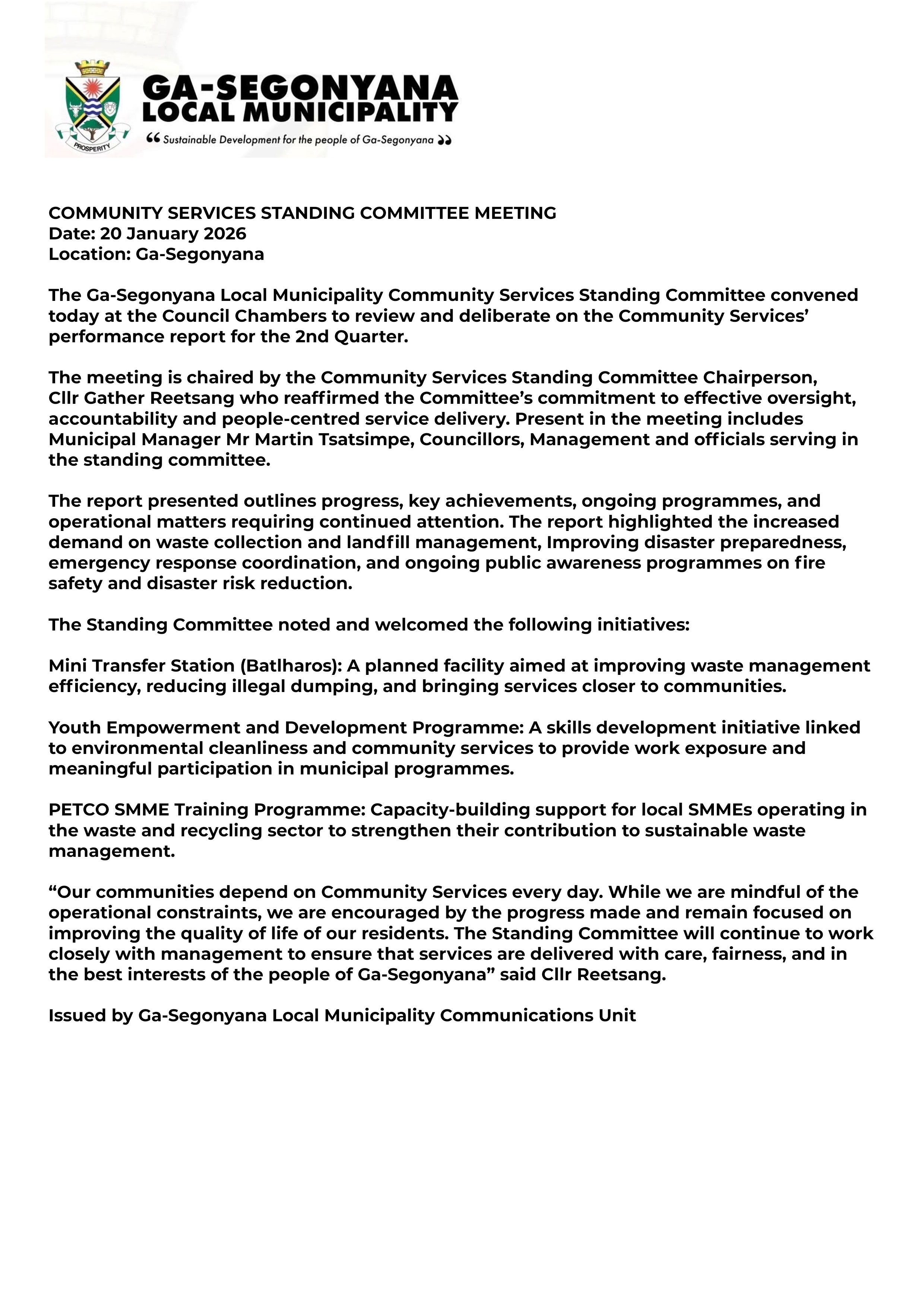 The Ga-Segonyana Local Municipality Community Services Standing Committee convened today at the Council Chambers to review and deliberate on the Community Services’ performance report for the 2nd Quarter. The meeting is chaired by the Community Services Standing Committee Chairperson, Cllr Gather Reetsang who reaffirmed the Committee’s commitment to effective oversight, accountability and people-centred service delivery. Present in the meeting includes Municipal Manager Mr Martin Tsatsimpe, Councillors, Management and officials serving in the standing committee. The report presented outlines progress, key achievements, ongoing programmes, and operational matters requiring continued attention. The report highlighted the increased demand on waste collection and landfill management, Improving disaster preparedness, emergency response coordination, and ongoing public awareness programmes on fire safety and disaster risk reduction.